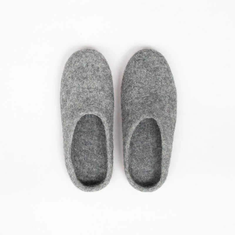 100% natural wool fibre felt slipper in oatmeal. Suede leather sole. Comes in a cotton branded drawstring bag. Available in S/M or M/LSize: M/L