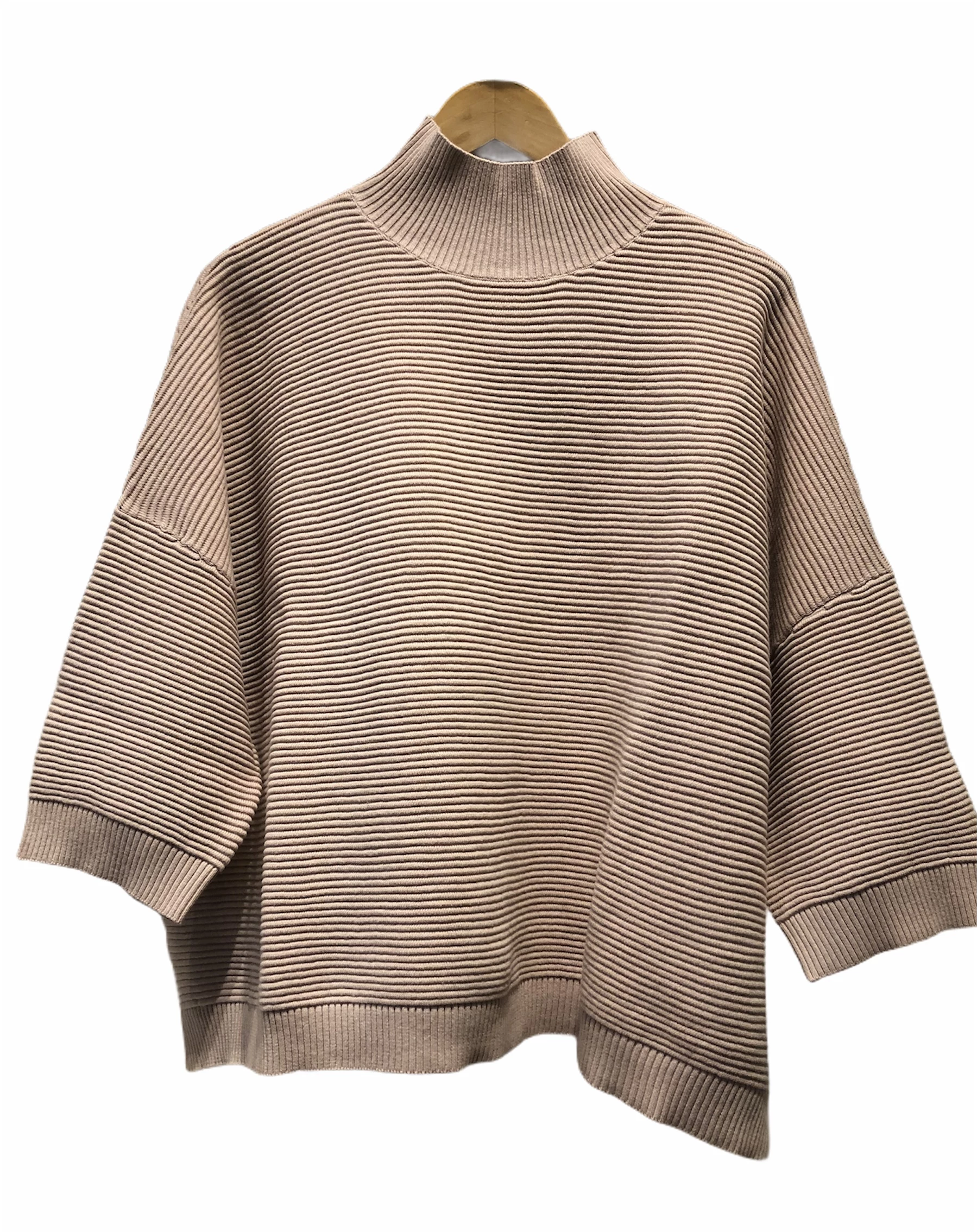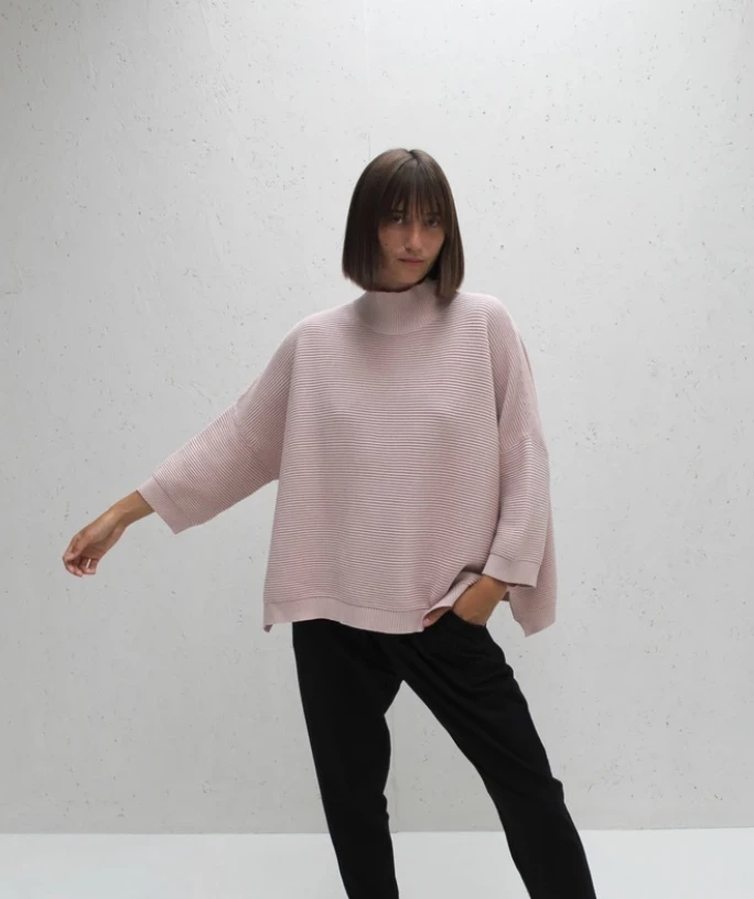 Vicki jumper is a stylish and relaxed shape. Cotton rib knit with funnel neck. It’s a versatile shape that is a flattering wardrobe must.