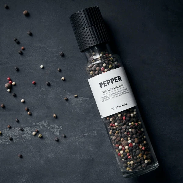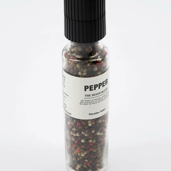 Enjoy the classic pepper mix from Nicolas Vahé with five different types of pepper: white, red, green, pink and black pepper corns. This pepper mix is an essential item in any home, especially when combined with the popular French sea salt from Nicolas Vahé. The mill comes with a ceramic grinder which gives you finely ground spices. This releases the oils for more aroma and flavour in your dishes. Size: 140 g. Content: White peppercorns, green peppercorns, black peppercorns, hot peppercorns, pink peppercorns.