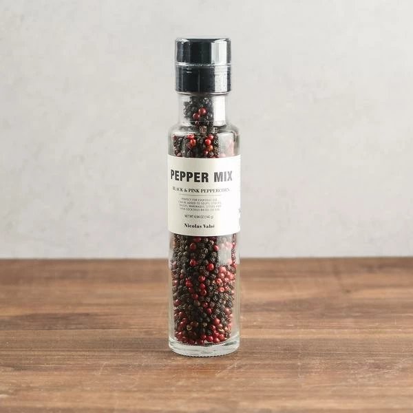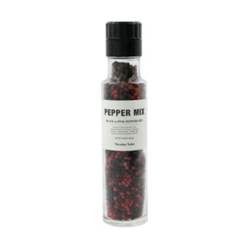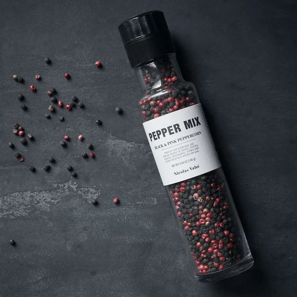 Nicolas Vahé gives you a versatile pepper mix with black and pink peppercorns. The rounded heat of pink peppercorns is closer to that of chili; compared to black peppercorns that are a bit more pungent. You will also notice a fruity undercurrent in the deep flavour that pink peppercorns add to the mix. Elevate the flavours in your cooking and season your dishes with a dash of this pepper mix – from your stews and curries to sauces and marinades. In a gin and tonic, a few pink peppercorns as garnish add a sweet flavour with a subtle heat. Ingredients 80 % black pepper corn, 20 % pink peppercorn