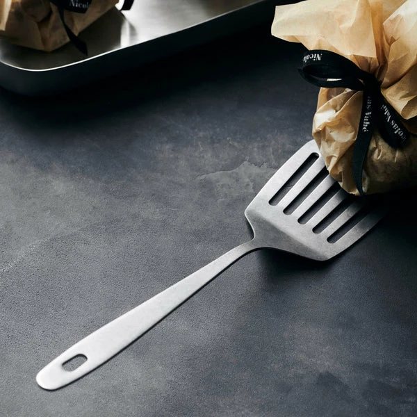Add a touch of minimal elegance to your cooking with this stainless steel spatula from Nicolas Vahé. More specifically, Daily is a slotted spatula. Thanks to the holes, it easily slides under meat, eggs and fish on the pan while also draining the fat away. You can also use it to cut and serve lasagna from an ovenproof dish. After use, let the spatula decorate your kitchen along with your other utensils from the Daily range. Size: l: 32 cm, w: 7.7 cm