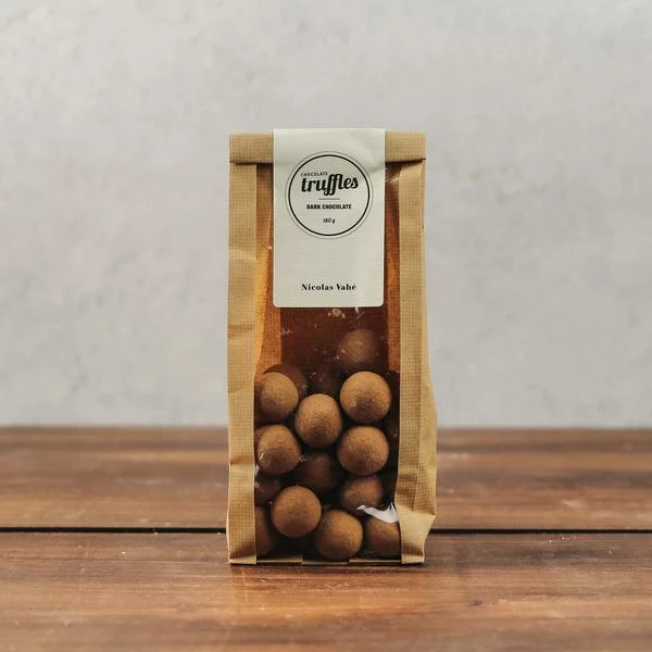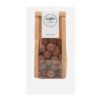 Enjoy the addictive taste of the very best dark chocolate from Nicolas Vahé. These delicious chocolate truffles are an irresistible addition to any coffee or tea break. Contents: 54% dark chocolate (sugar, cocoa mass, cocoa butter, emulsifier (@soya lecithins), natural vanilla flavouring), 21% marzipan (@almonds, sugar, invert sugar, water), sugar, cocoa powder, glucose syrup, thickener (gum arabic), rapeseed oil, humectant (invertase). Dark chocolate: cocoa solids 50% minimum.