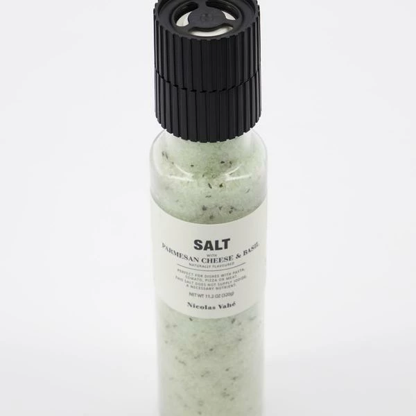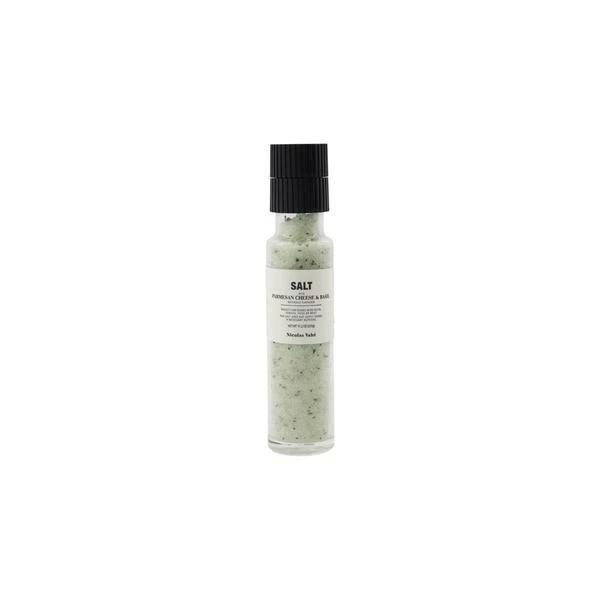 This salt with parmesan cheese and basil is an essential in your cooking. Enjoy the wonderful flavour and the beautiful green colour. It is ideal in pasta dishes and for pizza. The grinder is decorative and can be left out on the kitchen counter when not in use. The mill comes with a ceramic grinder which gives you finely ground spices. This releases the oils for more aroma and flavour in your dishes. Content: 96,6% salt, 3% parmesan (non-pasteurized @milk, salt, rennet), 0,3% basil, basil essential oil, colour (chlorophyll and chlorophyllins).