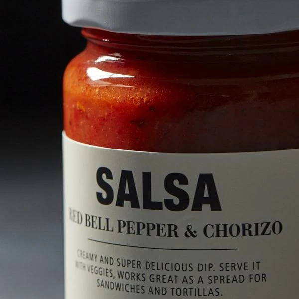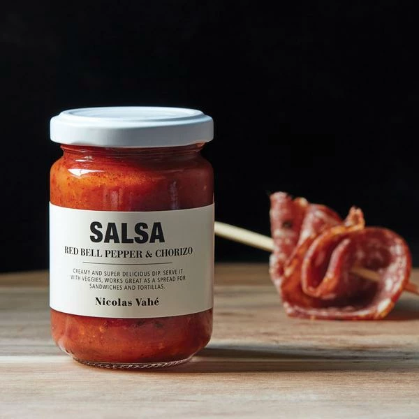 Salsa with red pepper & chorizo from Nicolas Vahé is a creamy and delicious dip that adds abundant flavour to your dishes – in no time. Use the salsa as a taste enhancer for vegetables, or as a spread in a sandwich or tortillas. Once opened: consume within 1 week and store in a cold place. Ingredients: 58% red bell pepper, onion, skinned tomatoes (tomatoes, tomato juice, acidity regulator (citric acid)), 4,4% chorizo sausage (pork meat, salt, chilli, spices), cane sugar, sunflower oil, white wine from Pays d’Oc, garlic, spices, salt, acidity regulator (lactic acid), aromatic herbs, rosemary extract.