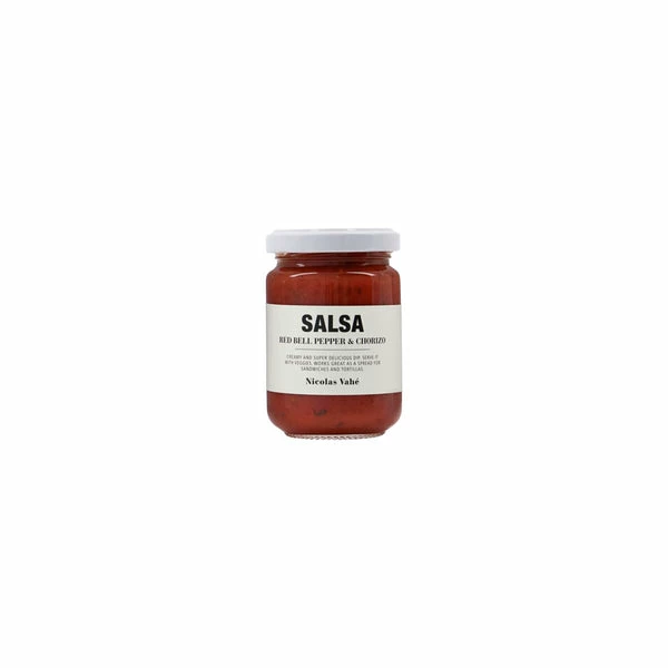 A delicious salsa with red pepper & chorizo from Nicolas Vahé. Perfect as a dip or as a garnish that will add abundant flavour to your dishes – in no time. Use the salsa as a taste enhancer for vegetables, or as a spread in a sandwich or tortillas. Once opened: consume within 1 week and store in a cold place. Ingredients: 58% red bell pepper, onion, skinned tomatoes (tomatoes, tomato juice, acidity regulator (citric acid)), 4,4% chorizo sausage (pork meat, salt, chilli, spices), cane sugar, sunflower oil, white wine from Pays d’Oc, garlic, spices, salt, acidity regulator (lactic acid), aromatic herbs, rosemary extract. 140g Jar