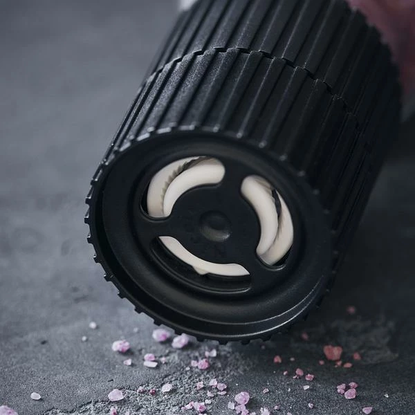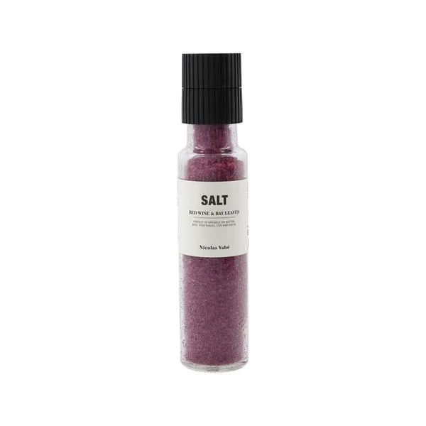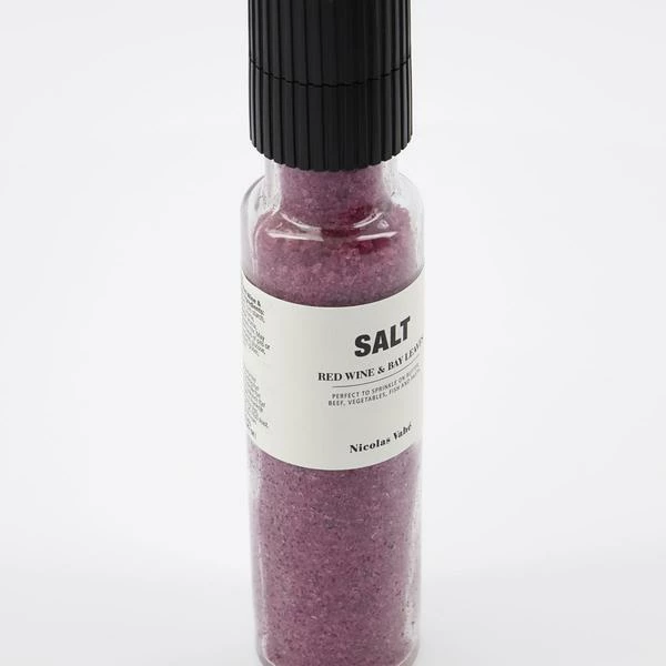 Salt blend with red wine and bay leaves is an exciting salt combination from Nicolas Vahé. The salt comes in a handy grinder with a fantastic design that makes it suitable as decoration when not in use. Enjoy the delicate red wine flavour by grinding it on top of butter. This salt is especially suitable for meat, fish, vegetables or pasta dishes as it helps to create a round flavour, and gives any dish a decorative touch. The mill comes with a ceramic grinder which gives you finely ground spices. This releases the oils for more aroma and flavour in your dishes. Contents: 87,4% sea salt, corn starch, 3,5% redwine, flavouring, hibiscus flavouring, 0,4% bay leaves mix. Weight: 340g