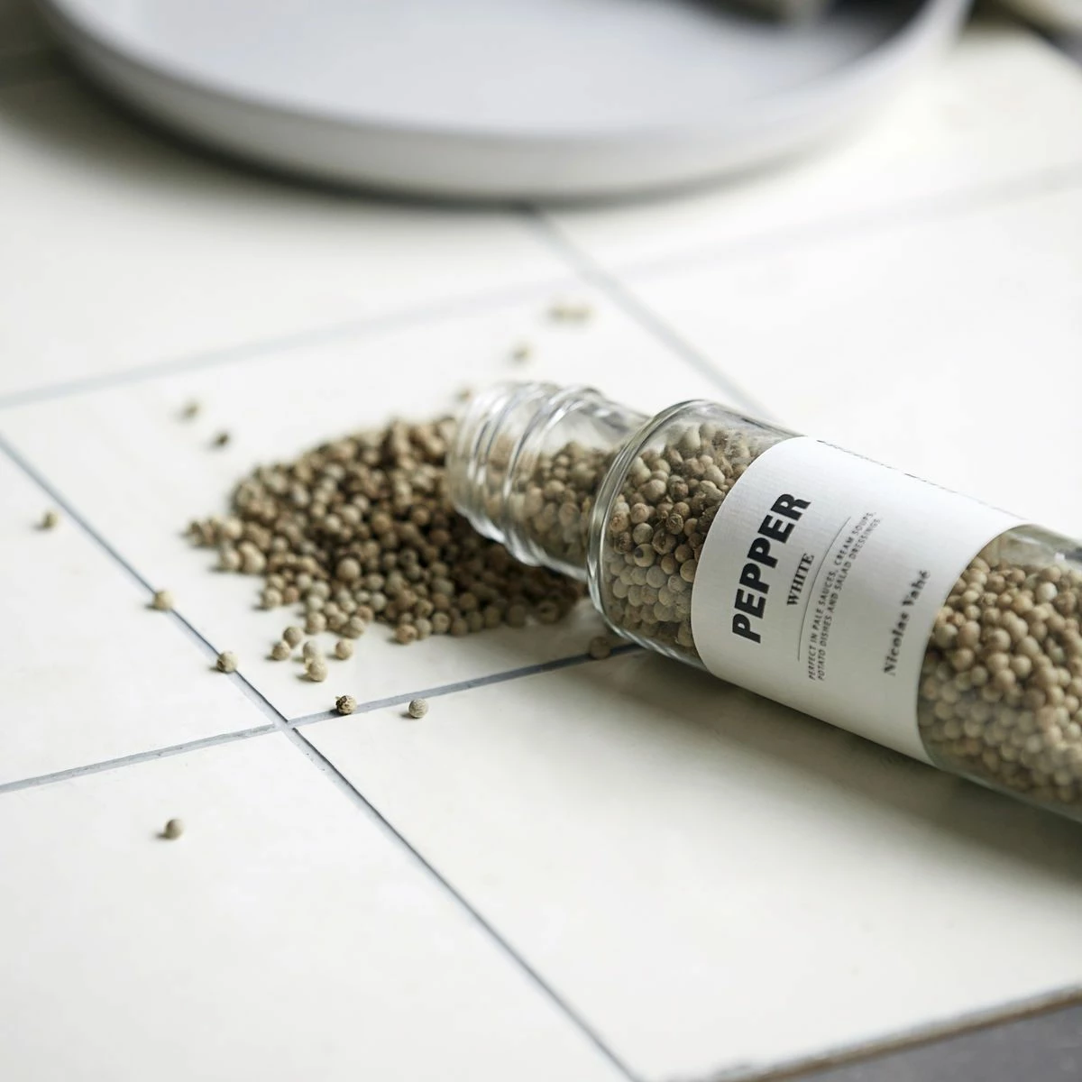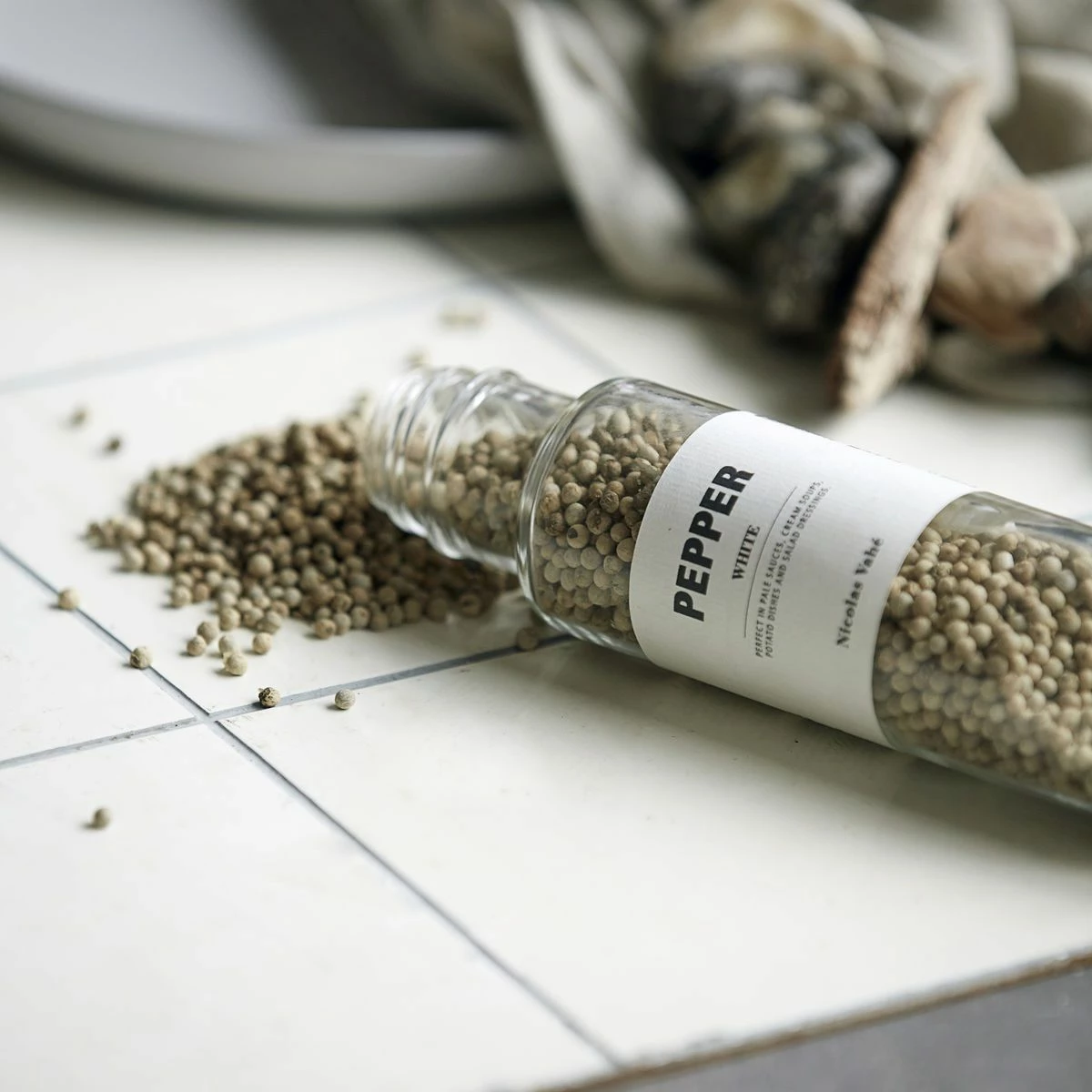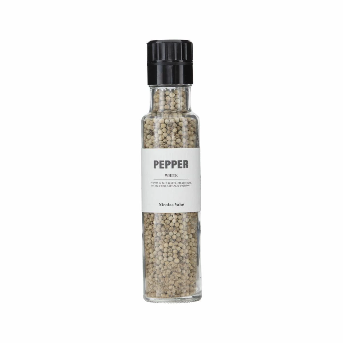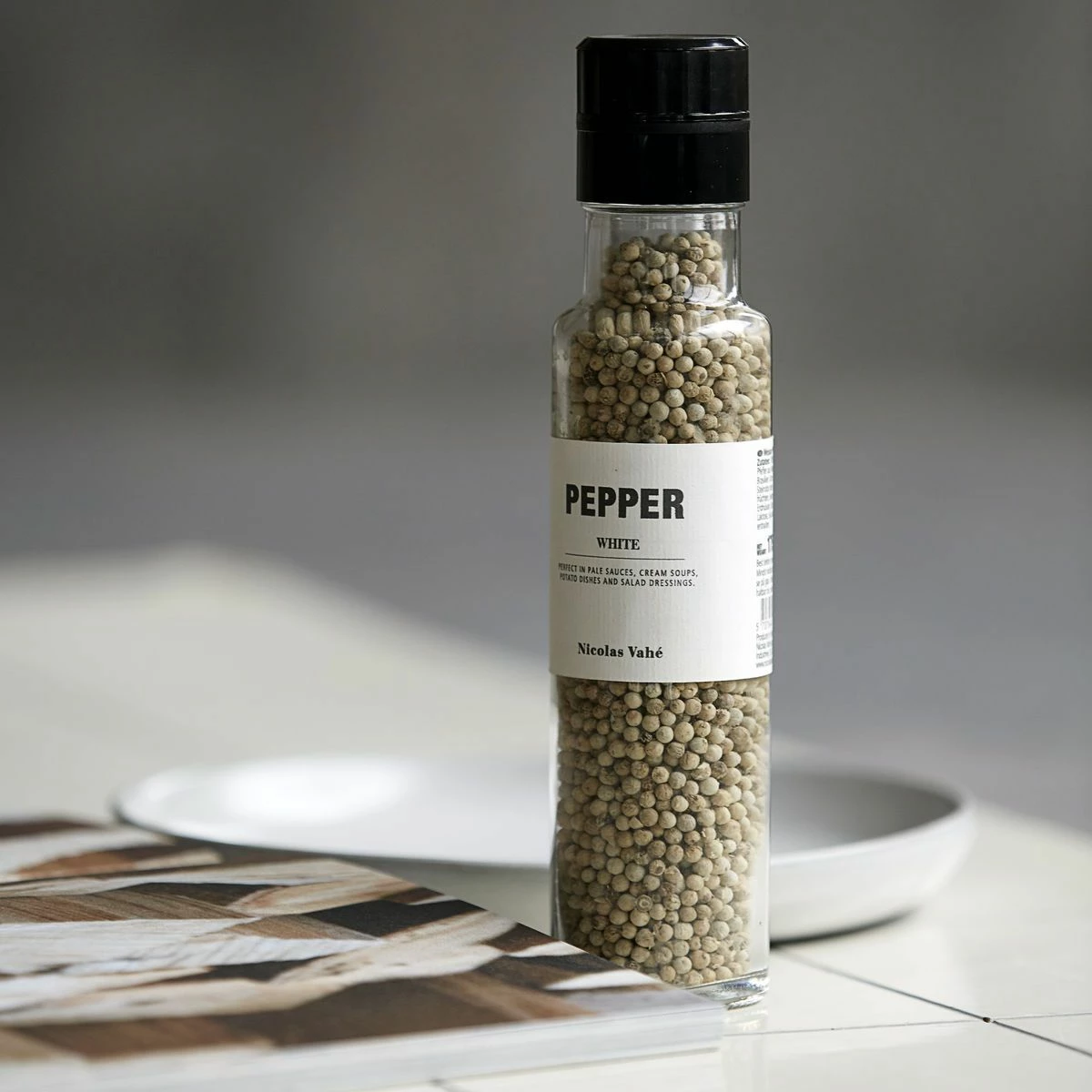 Enjoy the delicious and delicate white pepper from Nicolas Vahé that has a strong, distinctive flavour and a light aroma. Make the most delicious sauces with white pepper, or use it in soups, potato dishes and salad dressings to add extra flavour. The fine and bright peppercorns come in a beautiful and decorative grinder, so you can display it on your dining table or in your kitchen along with other spices. Shelf life after opening: 16 months.